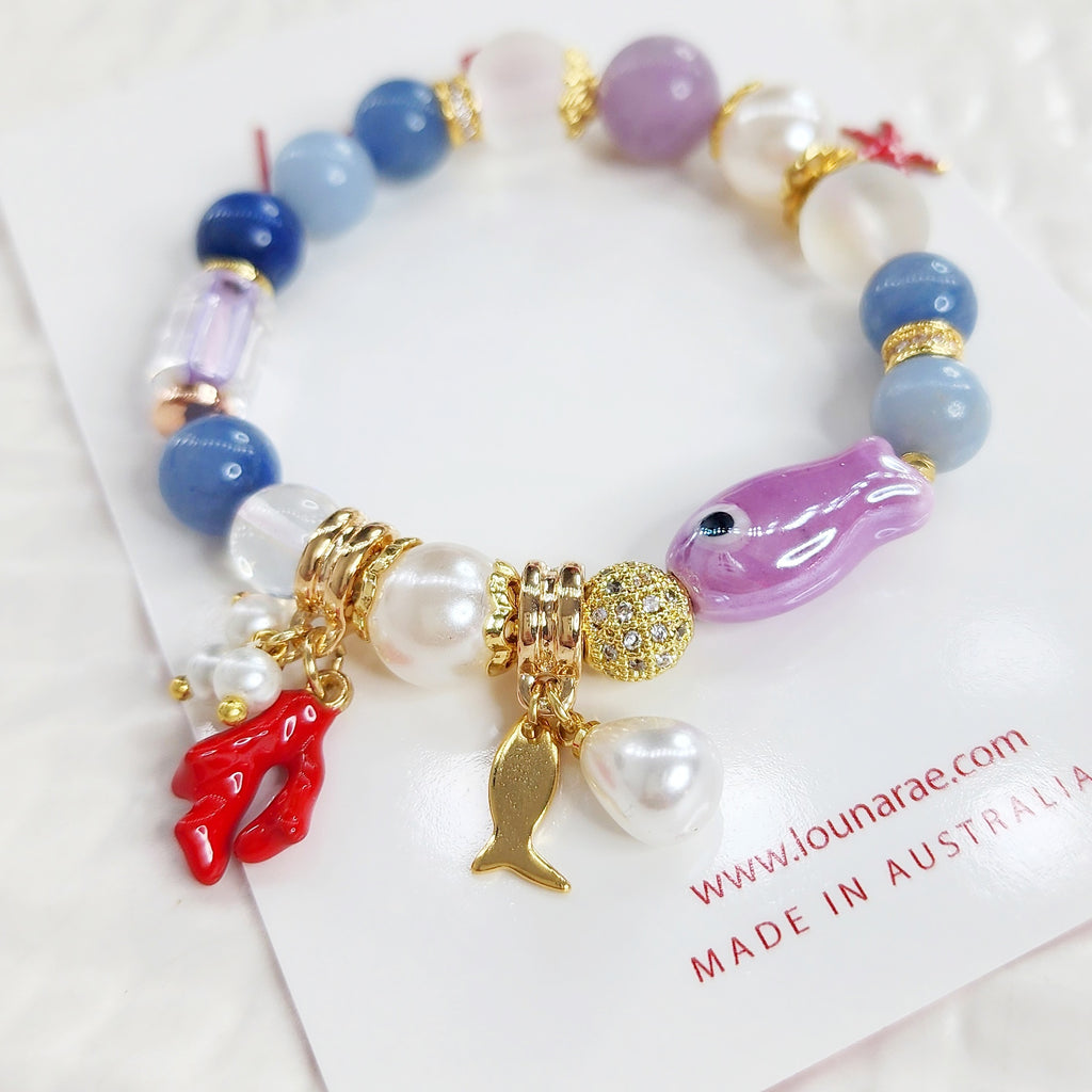 Beautiful elastic bracelet made with beads and selected long lasting spacers and charms