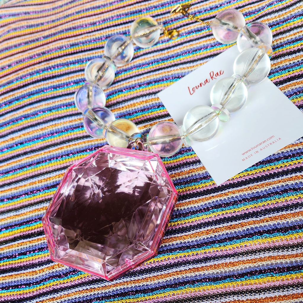 Beautiful statement necklace made of acrylic pendant, 304 Stainless Steel Ball Chain Necklace (40.5cm), Round Clear Hollographic Beads(20mm).