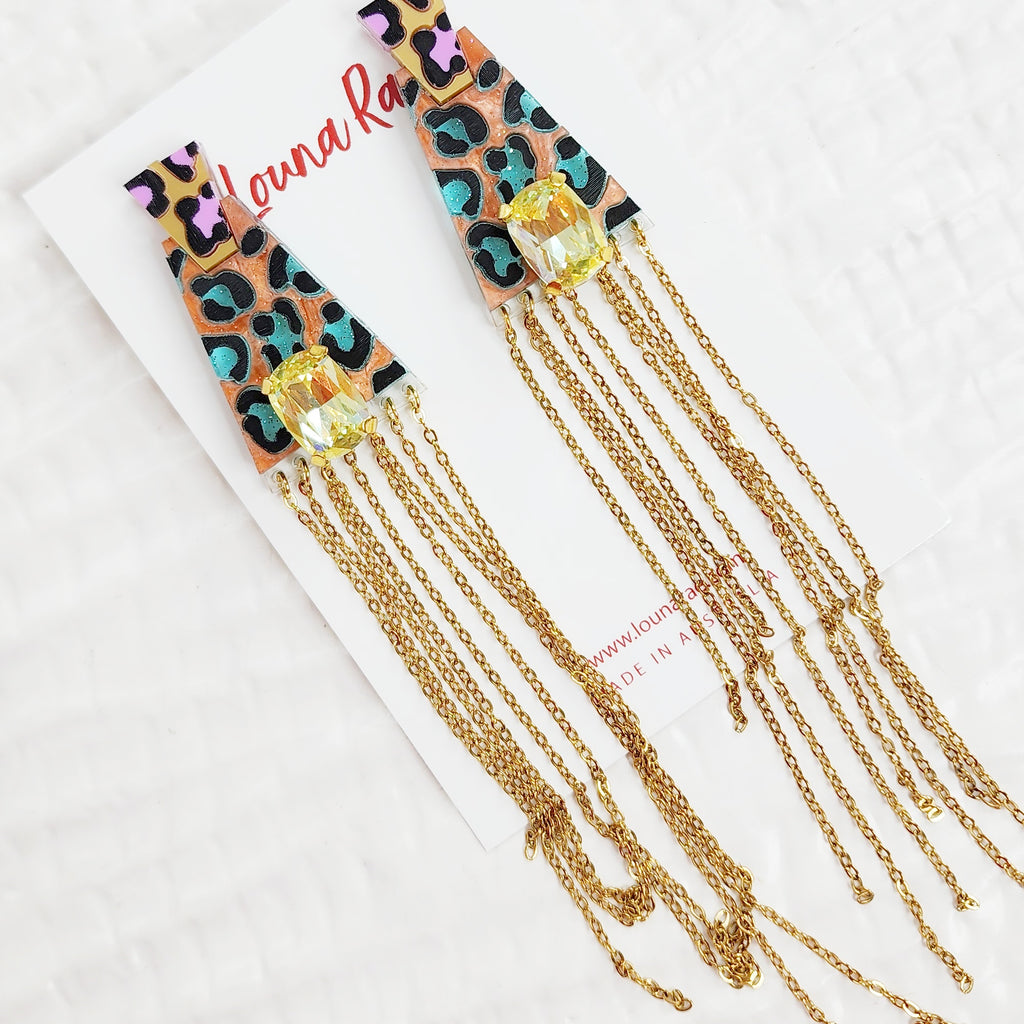 Beautiful statement earrings made of laser cut acrylic and Ion plating (IP) 304 Stainless steel cable chain.